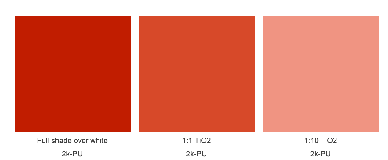 Das Pigment zeigt in 2K-PU-Bindemitteln sowohl im Vollton als auch im Abtönbereich eine hohe Licht- und Witterungsbeständigkeit. Aufgrund der guten chemischen und Lösemittelbeständigkeit ist Fanchon® Orange 36 für wasserbasierte und aminvernetzende Systeme geeignet und bietet stabile Farbtöne auf metallischen und mineralischen Untergründen.